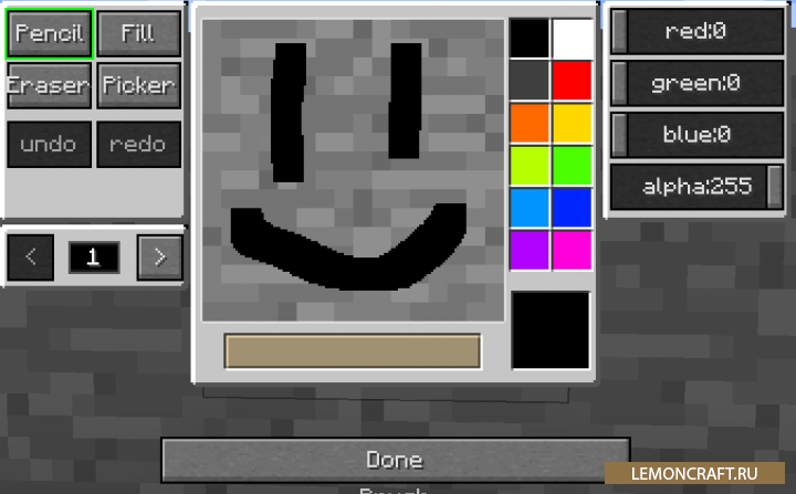 Мод на рисование MC Paint добавляет в игру инструмент, который позволит вам рисовать на блоках все что вашей душе угодно. Данный инструмент очень похож на стандартный Paint который вы можете видеть в Windows. После установки данного мода вы сможете разрисовать свое жилище во все цвета радуги. Так же вы можете сделать надписи, например дать названия улицам и проставить номера домов. Во время создания рисунка можно выбрать различные расширения: 16х16, 32х32, 64х64 и 128х128 пикселей. Рисунок можно скопировать и перенести его на другие блоки.